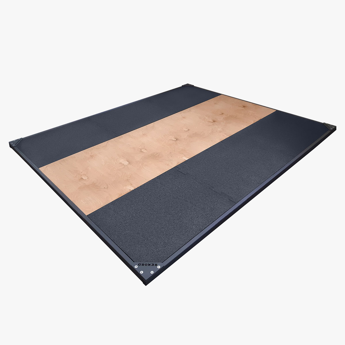 REKORD training platform made of the best materials to increase durability, stability and visual appeal. The platform is permanently constructed with a solid wooden base made on our presses so that the footbridge for the athlete does not bend into a so-called “banana” as is the case with standard plywood bought from carpenter’s shops. Our special high-density rubber mats complete the platform with an extremely durable, odourless lifting zone.